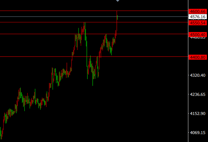 地缘政治风险的急剧上升,直接刺激了避险资产需求,推动现货黄金周一价格强势上涨 ,延续前两个交易日涨势,一度触及4600的历史新高,现交投于每盎司4570美元附近 。技术面早盘金价急涨再创新高 ,短线伴随着快速回调,右侧耐心等待回调测试4550支撑情况,左侧我们暂时观望等待1月20日在做布局。